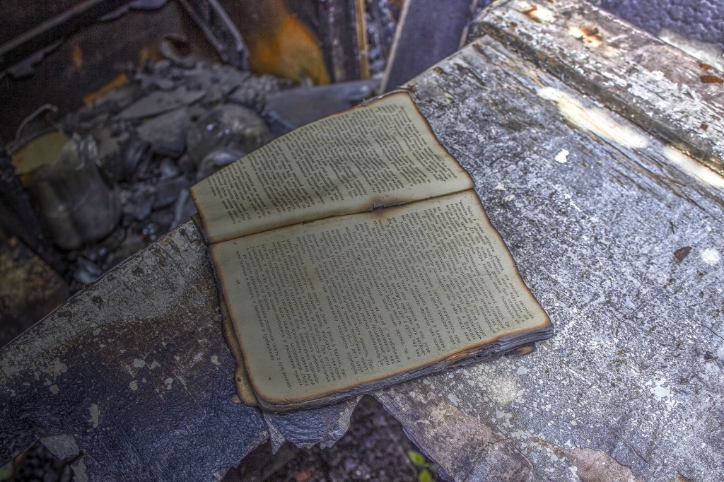 Once the fire was out and the braying of the sirens disappeared around the corner, a young boy spotted something amongst the burnt timber and the ash. The corner of an old book poked up from the detritus. Something about beckoned to him and curiosity finally bit him hard. He slipped under the safety tape and watched in horrific fascination as his hand grasped the book and pulled it free.
